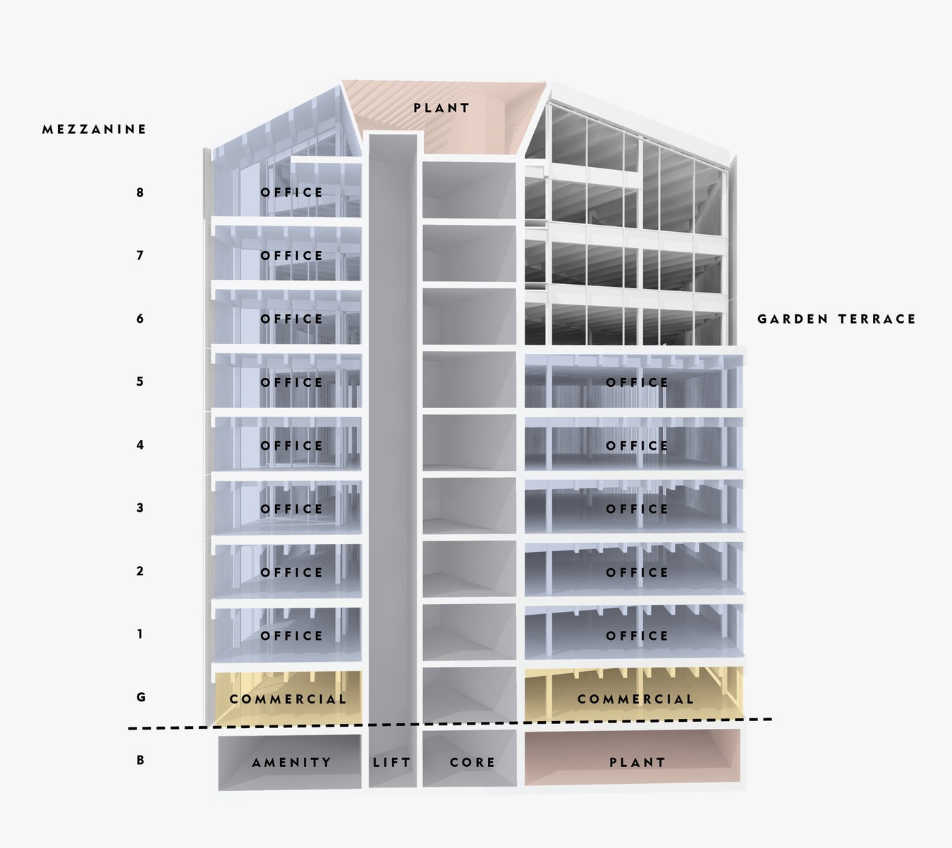 The building’s low profile roof will minimise the impact on neighbouring buildings, while its unified façade, made up of vertical louvres, responds to solar gain and glare from the primary east and west facades.