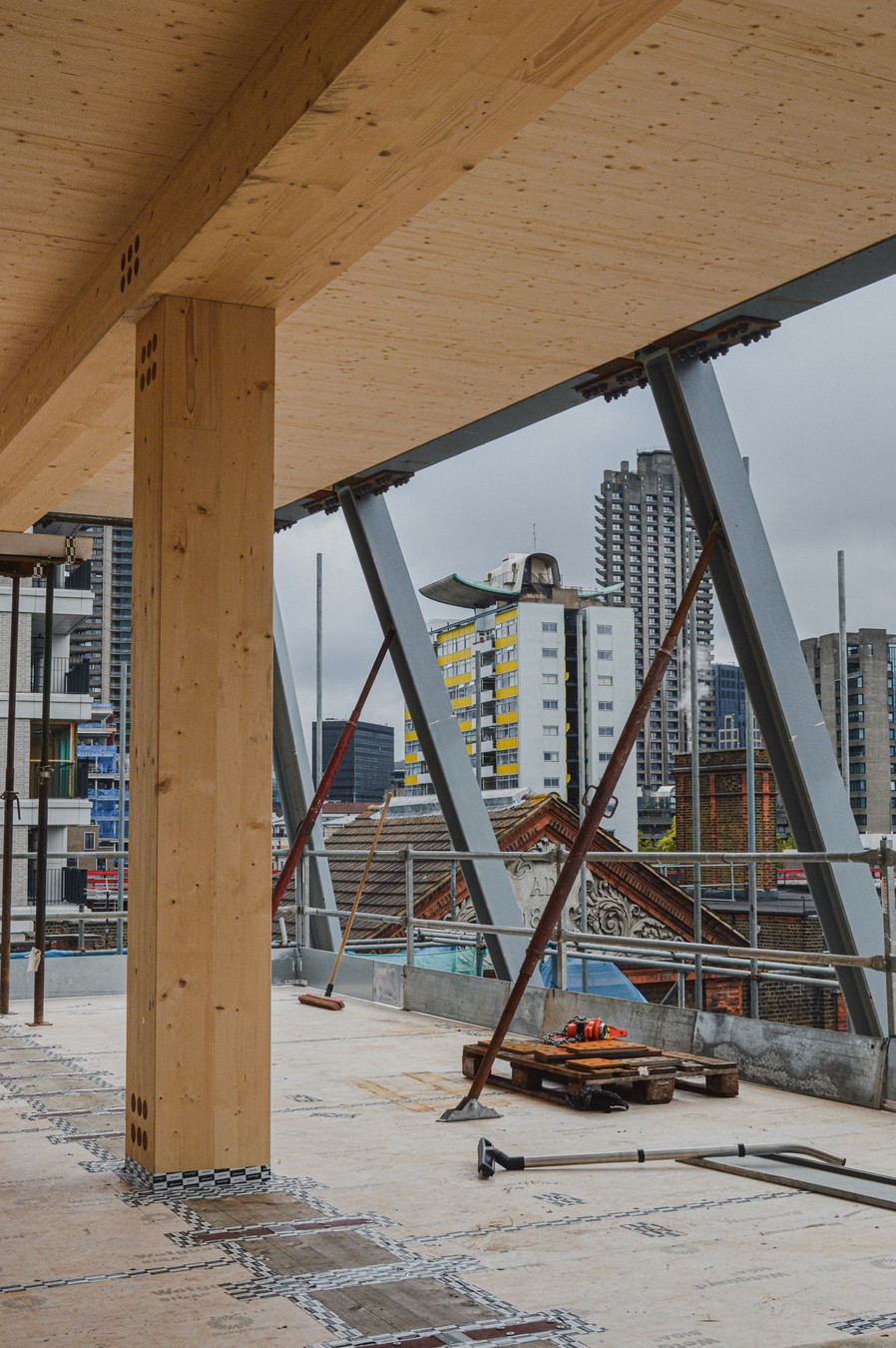 Current ongoing works include the refurbishment of the lower ground floors, the removal of the existing mansard roof and the installation of the Glulam beams and columns and the CLT slabs.