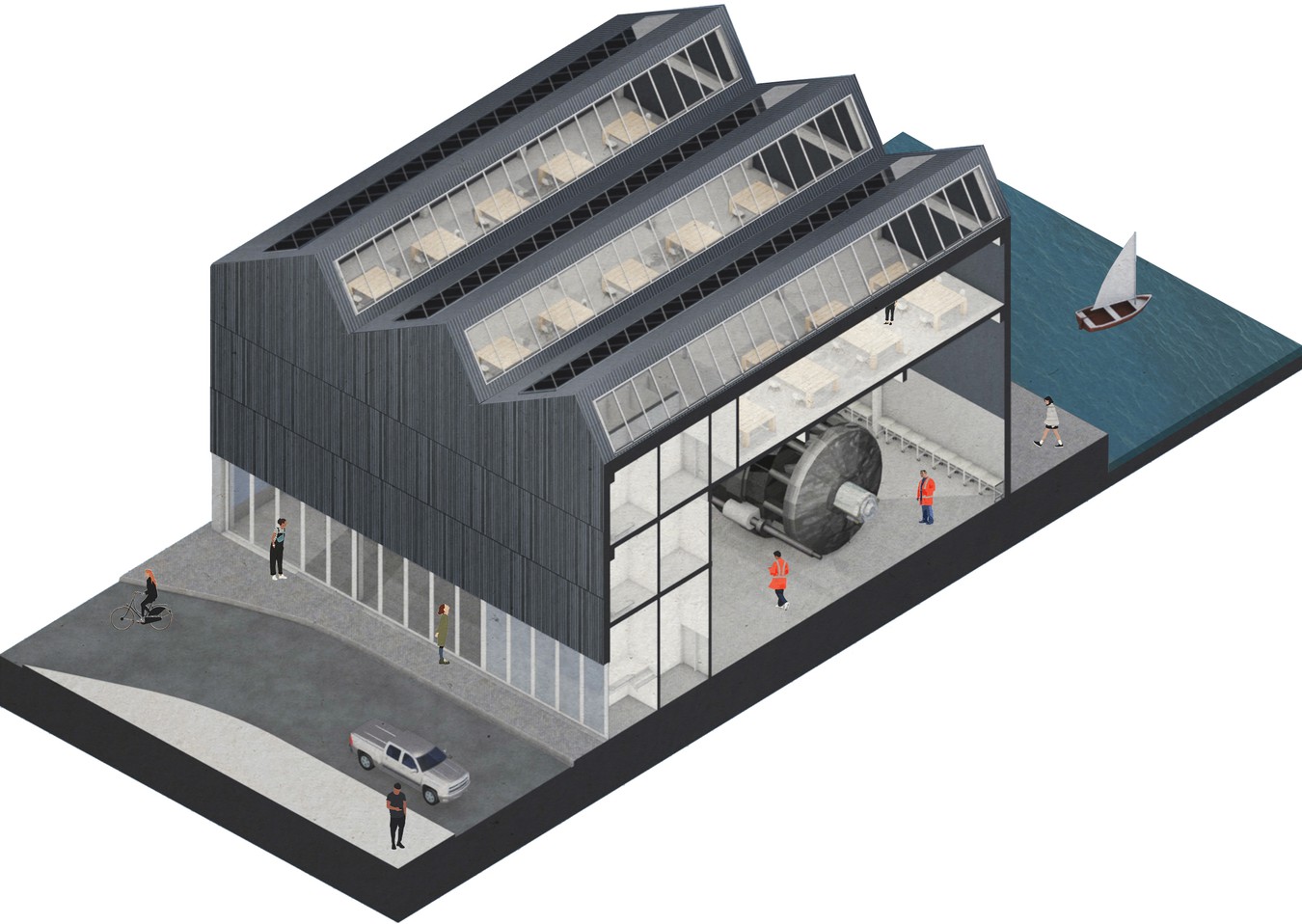 The new Fish Shed buildings reimagine familiar light industrial forms to deliver a variety of spaces across three levels. These range from 10m high manufacturing and testing halls to traditional office floorplates with panoramic views of the Kasbah conservation area, fish docks and the north sea beyond.